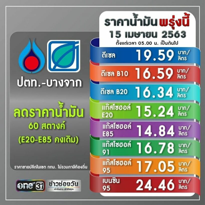 มีการรายงานว่า บมจ.ปตท. และ บมจ.บางจากปิโตรเลียม ประกาศปรับลดราคาน้ำมันกลุ่มแก๊สโซฮอล์ และ กลุ่มดีเซล ปรับลด 60 สตางค์/ลิตร ยกเว้น E20 และ E85 ราคาคงเดิม มีผลตั้งแต่เวลา 05.00 น. วันที่ 15 เม.ย. 63