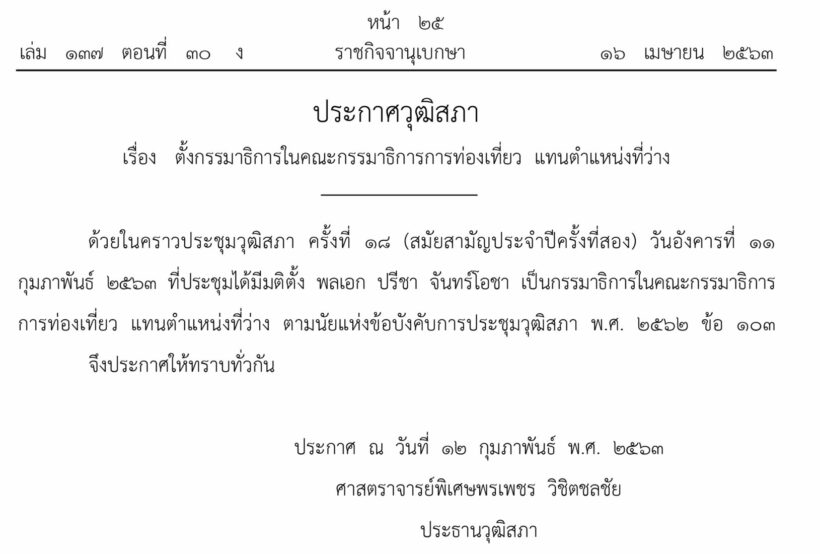 เว็บไซต์ราชกิจจานุเบกษา ประกาศวุฒิสภา เรื่อง ตั้งกรรมาธิการในคณะกรรมาธิการการท่องเที่ยว แทนตำแหน่งที่ว่าง
