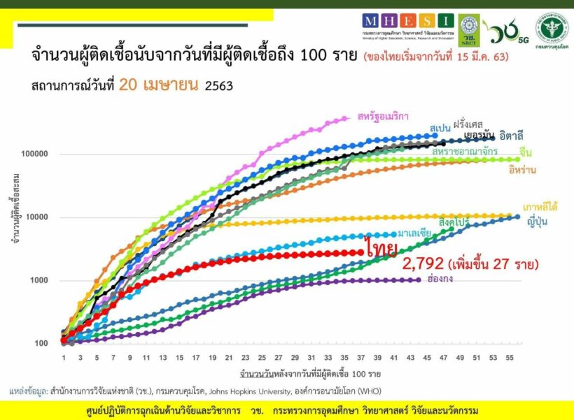กรมควบคุมโรค และสำนักงานการวิจัยแห่งชาติ (วช.) กระทรวงการอุดมศึกษาฯ (อว.)รายงานข้อมูลสถานการณ์การติดเชื้อโควิด-19 ณ วันจันทร์ที่ 20 เมษายน 2563 ประเทศไทย