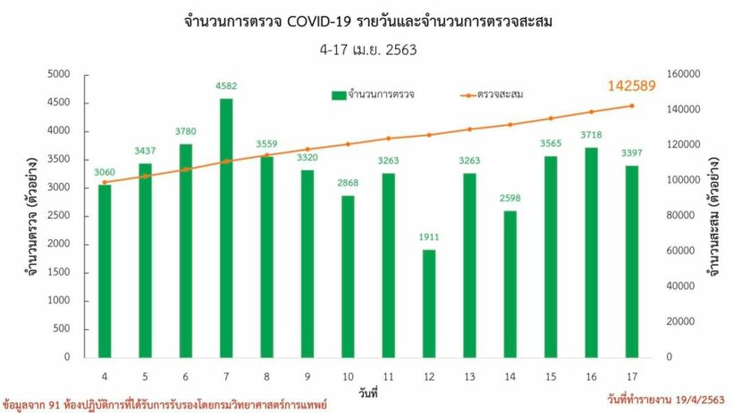 ซึ่งมีการตรวจวินิจฉัจโรค ในระหว่างวันที่ 11-17 เมษายน 2563 ได้ตรวจไปแล้ว 21,715 ตัวอย่าง โดยห้องปฏิบัติการที่ได้รับการรับรองจากกรมวิทยาศาสตร์การแพทย์ 91 แห่งทั่วประเทศ