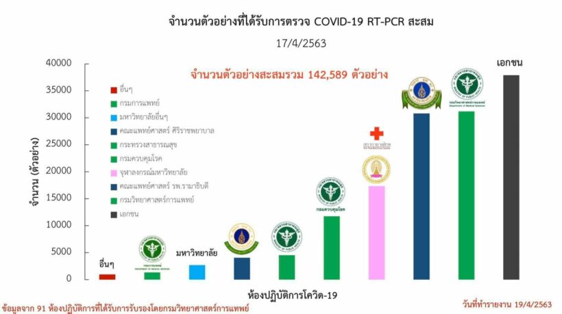 ซึ่งมีการตรวจวินิจฉัจโรค ในระหว่างวันที่ 11-17 เมษายน 2563 ได้ตรวจไปแล้ว 21,715 ตัวอย่าง โดยห้องปฏิบัติการที่ได้รับการรับรองจากกรมวิทยาศาสตร์การแพทย์ 91 แห่งทั่วประเทศ