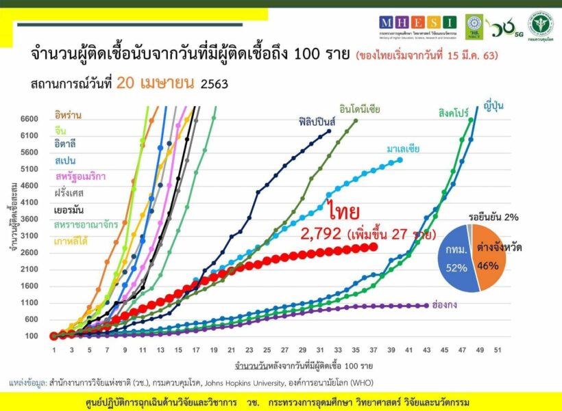 กรมควบคุมโรค และสำนักงานการวิจัยแห่งชาติ (วช.) กระทรวงการอุดมศึกษาฯ (อว.)รายงานข้อมูลสถานการณ์การติดเชื้อโควิด-19 ณ วันจันทร์ที่ 20 เมษายน 2563 ประเทศไทย
