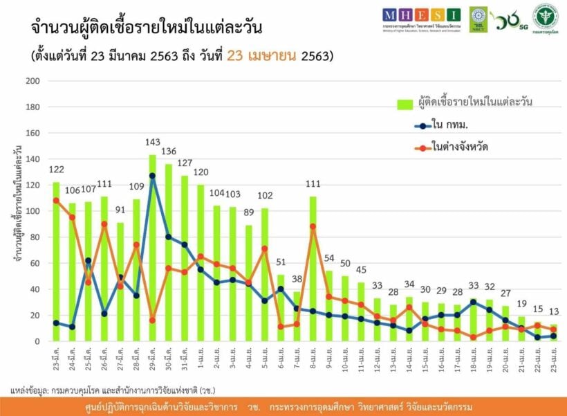โควิด-19 23 เมษายน ไทยติดเชื้อเพิ่ม 13 ราย ตาย 1 ราย