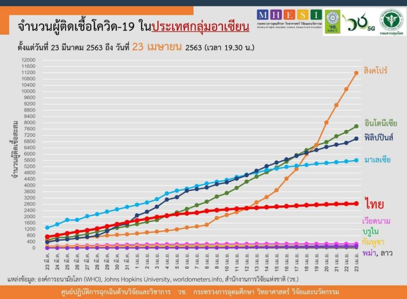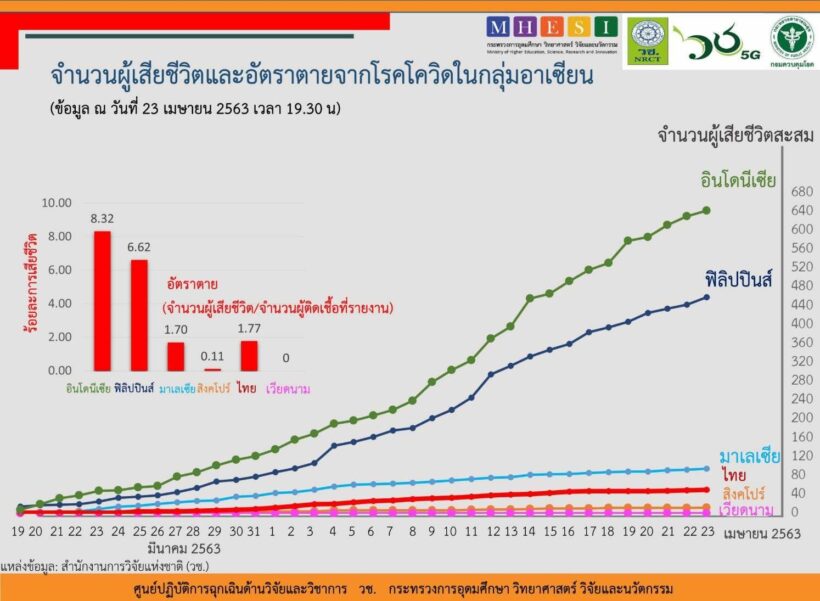 สำนักงานการวิจัยแห่งชาติ (วช.) กระทรวงการอุดมศึกษาฯ (อว.) รายงานสถานการณ์การติดเชื้อโควิด-19 ในอาเซียน ณ วันที่ 23 เมษายน 2563 เวลา 19.30 น.
