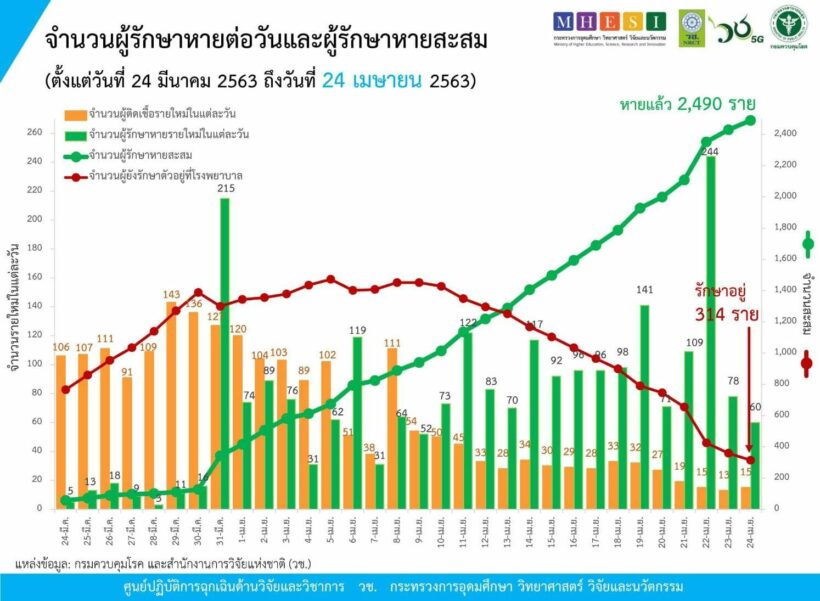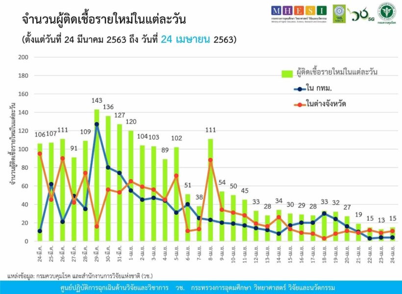 กรมควบคุมโรค และสำนักงานการวิจัยแห่งชาติ (วช.) กระทรวงการอุดมศึกษาฯ (อว.) รายงานข้อมูลสถานการณ์การติดเชื้อโควิด-19 ณ วันศุกร์ที่ 24 เมษายน 2563