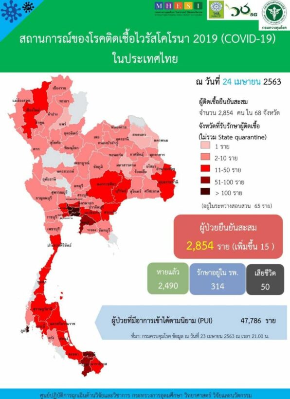 ประเทศไทย ผู้ติดเชื้อสะสม 2,854 ราย ใน 68 จังหวัด (เพิ่มขึ้นในวันนี้ 15 ราย) เสียชีวิตรวม 50 ราย (ไม่มีผู้เสียชีวิตเพิ่มขึ้นในวันนี้)