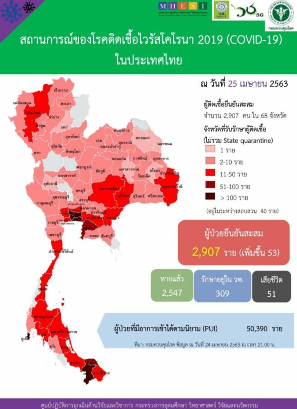 ประเทศไทย ผู้ติดเชื้อสะสม 2,907 ราย ใน 68 จังหวัด (เพิ่มขึ้นในวันนี้ 53 ราย *จากศูนย์กักกันคนเข้าเมือง 42 ราย)เสียชีวิตรวม 51 ราย (เพิ่มขึ้น 1 ราย)