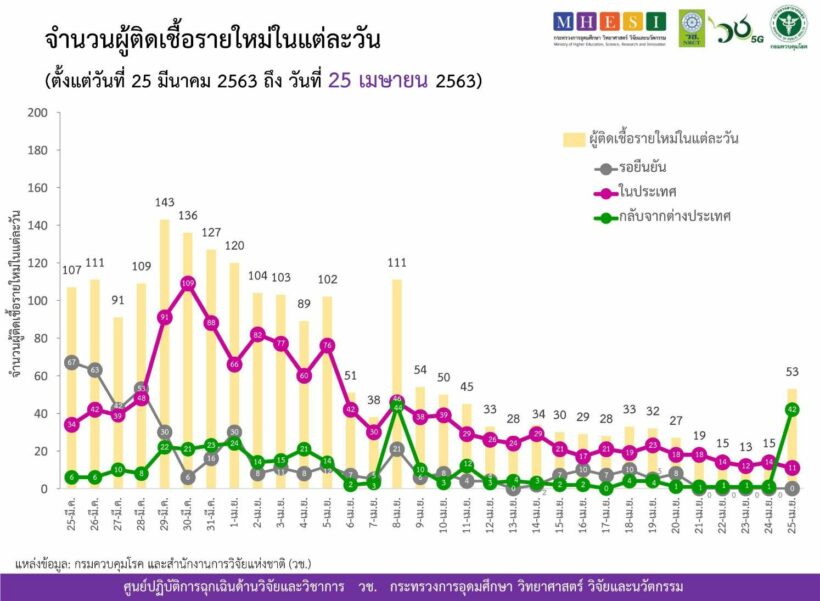 กรมควบคุมโรค และสำนักงานการวิจัยแห่งชาติ (วช.) กระทรวงการอุดมศึกษาฯ (อว.) รายงานข้อมูลสถานการณ์การติดเชื้อโควิด-19 ณ วันเสาร์ที่ 25 เมษายน 2563