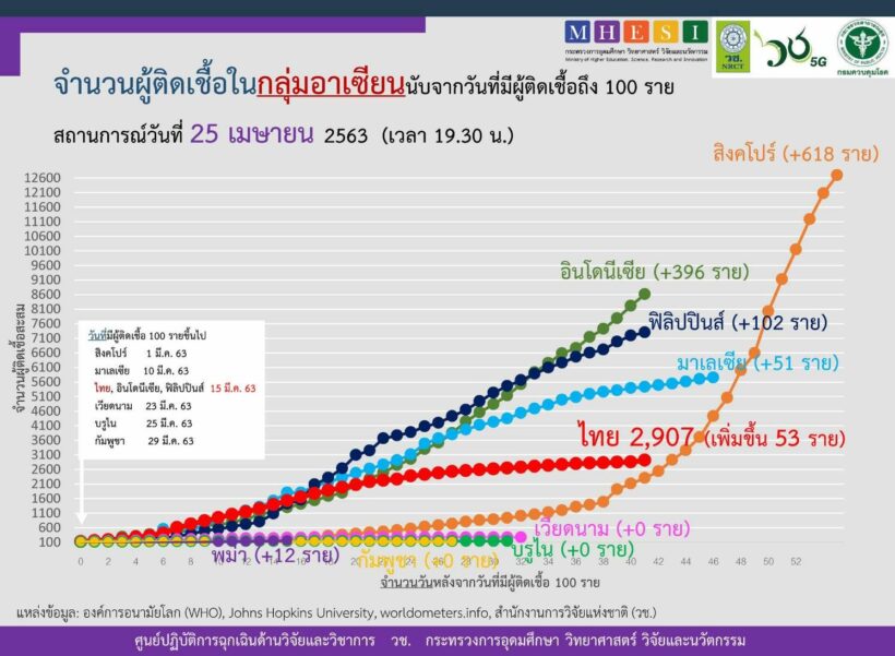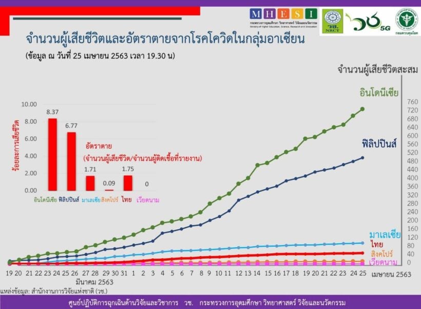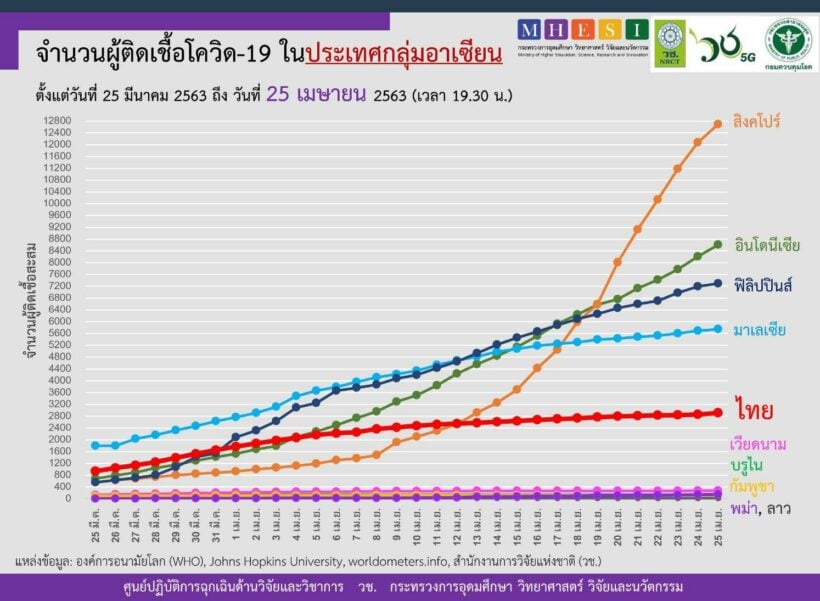 สำนักงานการวิจัยแห่งชาติ (วช.) กระทรวงการอุดมศึกษาฯ (อว.)สถานการณ์การติดเชื้อโควิด-19 ในอาเซียน ณ วันที่ 25 เมษายน 2563 เวลา 19.30 น.