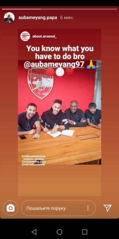 แต่ล่าสุด พ่อแท้ๆ ของ โอบาเมยอง ซึ่งใช้ชื่อในอินสตาแกรมว่า @aubameyang.papa ออกมาสร้างความหวังให้กับแฟนปืนใหญ่ ด้วยการรีโพสต์รูปที่แฟนบอลคนหนึ่งแท็กมาหาในอินสตาแกรม โดยเป็นภาพจากตอนที่ ดาวยิงวัย 30 ปี กำลังเซ็นสัญญาฉบับแรกกับ อาร์เซนอล ในปี 2018 ในรูปดังกล่าวยังมีข้อความเขียนกำกับไว้ด้วยว่า