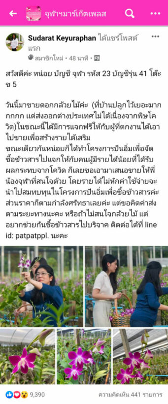 “วันนี้มาขายดอกกล้วยไม้ค่ะ (ที่บ้านปลูกไว้เยอะมากกกกก เเต่ส่งออกต่างประเทศไม่ได้เนื่องจากพิษโควิด) ในขณะนี้ได้มีการแจกฟรีให้กับผู้ที่ตกงานได้เอาไปขายเพื่อสร้างรายได้เสริม”
