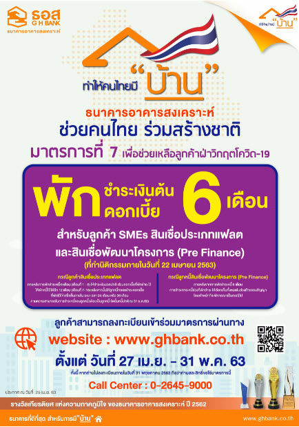ทั้งนี้ผู้เข้าเกณฑ์มาตรการที่ 7 (ตามรายละเอียดข้างต้น) จะต้องมีสถานะบัญชีปกติ และทำนิติกรรมภายในวันที่ 22 เมษายน 2563 ภายหลังจากการพักชำระหนี้ให้กลับไปใช้อัตราดอกเบี้ย ตามเงื่อนไขของสัญญาเดิมโดยไม่ถือว่าเป็นการผิดนัดชำระหนี้หรือเสียประวัติข้อมูลเครดิต เพื่อให้ผู้ประกอบการ SMEs มีเงินทุนและสภาพคล่องเพียงพอในการดำเนินธุรกิจและรักษาการจ้างงาน ส่วนดอกเบี้ยที่พักชำระไว้ ธนาคารได้แบ่งเบาภาระค่าใช้จ่ายในการชำระให้แก่ลูกค้า แบ่งเป็นกรณีสินเชื่อแฟลต ให้พักชำระดอกเบี้ยได้อีก 12 เดือน จากนั้นให้ทยอยชำระดอกเบี้ยที่พักชำระไว้ภายใน 24 เดือน หรือ 36 เดือน ตามความสามารถในการชำระหนี้ของลูกหนี้ ส่วนกรณีสินเชื่อพัฒนาโครงการ (Pre Finance) ให้ชำระในช่วงท้ายของสัญญากู้เงิน ลงทะเบียนแจ้งความประสงค์เข้ามาตรการผ่านทาง www.ghbank.co.th ตั้งแต่วันที่ 27 เมษายน – 31 พฤษภาคม 2563