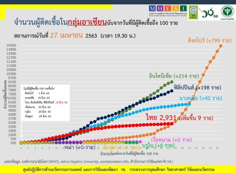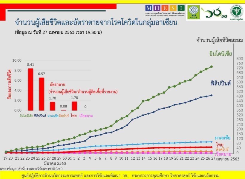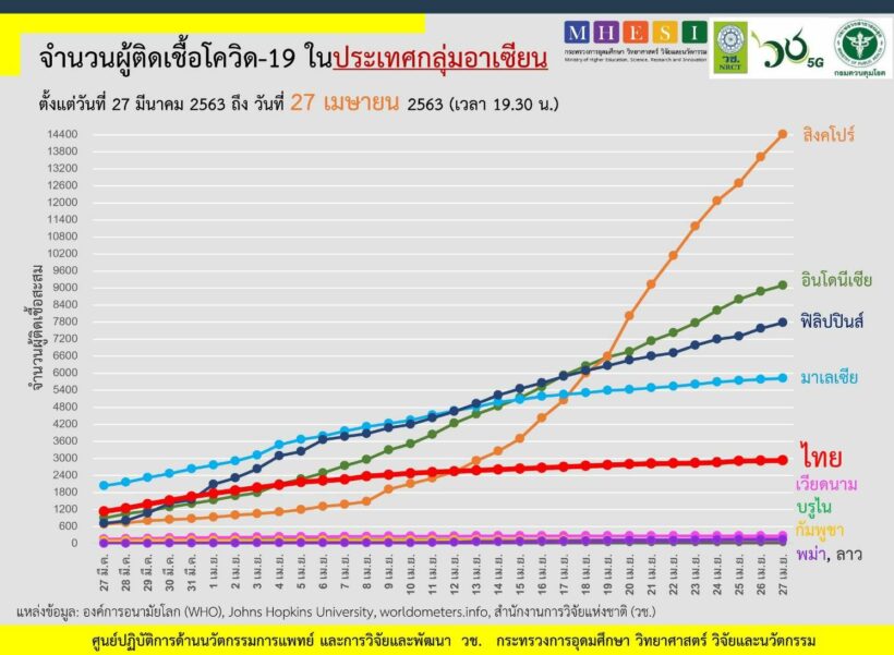 สำนักงานการวิจัยแห่งชาติ (วช.) กระทรวงการอุดมศึกษาฯ (อว.) สถานการณ์การติดเชื้อโควิด-19 ในอาเซียน ณ วันที่ 27 เมษายน 2563 เวลา 19.30 น.