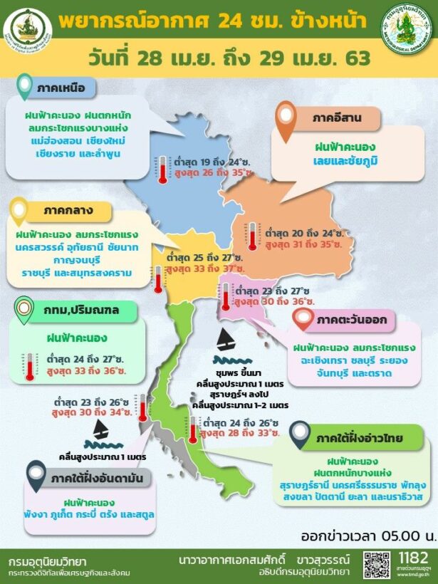 กรมอุตุฯ พยากรณ์อากาศ 24 ชั่วโมงข้างหน้า นับตั้งแต่วันที่ 28 เมษายน เป็นต้นไป โดยทางด้านภาคเหนือ และ ภาคใต้ เป็นสองภาคที่อาจเจอกับฝนตกหนัก พร้อมกับต้องระวังเรื่องน้ำท่วมฉับพลัน และน้ำปาไหลหลากด้วย