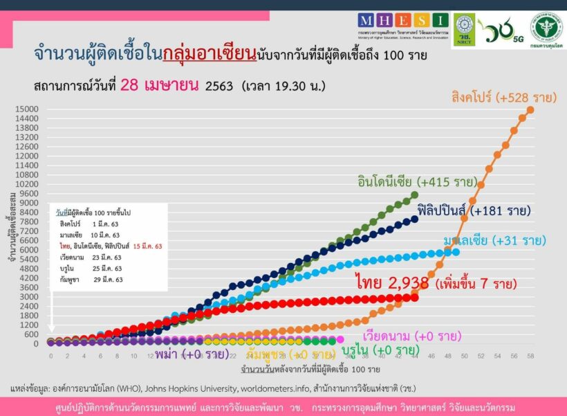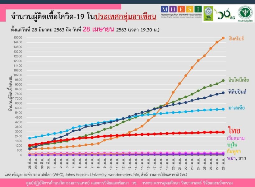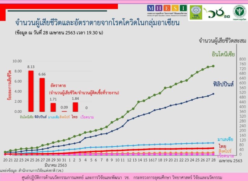 สำนักงานการวิจัยแห่งชาติ (วช.) กระทรวงการอุดมศึกษาฯ (อว.) สถานการณ์การติดเชื้อโควิด-19 ในอาเซียน ณ วันที่ 28 เมษายน 2563 เวลา 19.30 น.