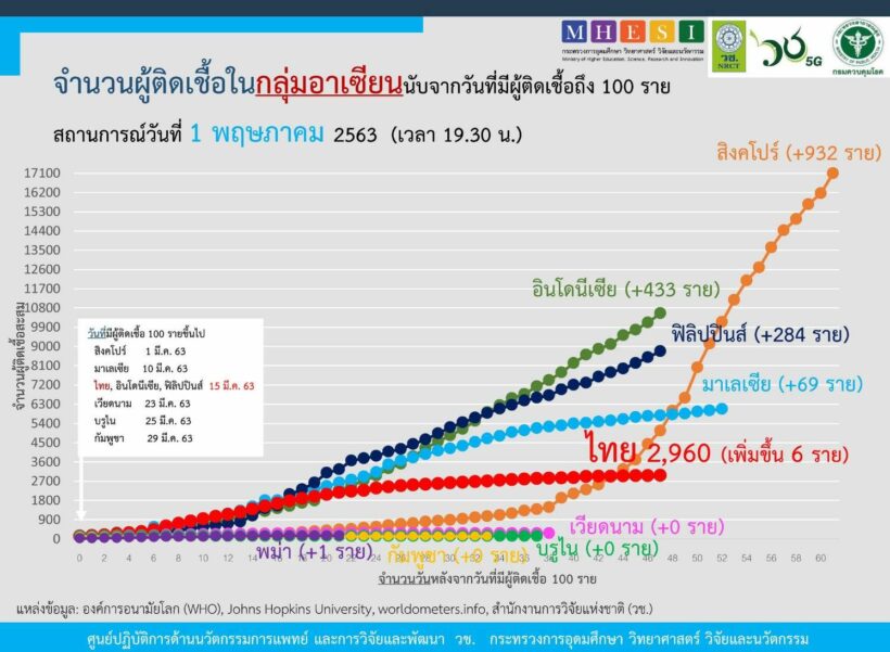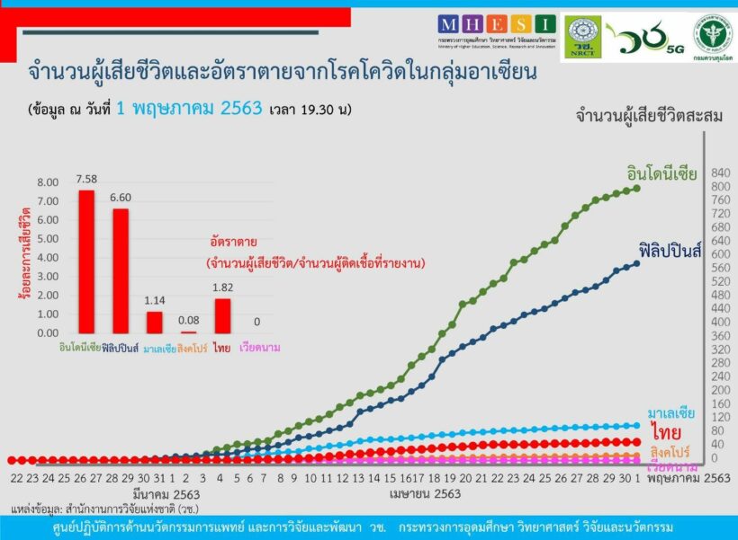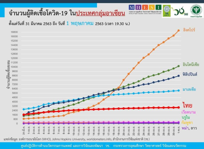 ศูนย์ปฏิบัติการด้านนวัตกรรมการแพทย์ และการวิจัยและพัฒนา สำนักงานการวิจัยแห่งชาติ (วช.) กระทรวงการอุดมศึกษาฯ (อว.) รายงาน สถานการณ์การติดเชื้อโควิด-19 ในอาเซียน ณ วันที่ 1 พฤษภาคม 2563 เวลา 19.30 น.