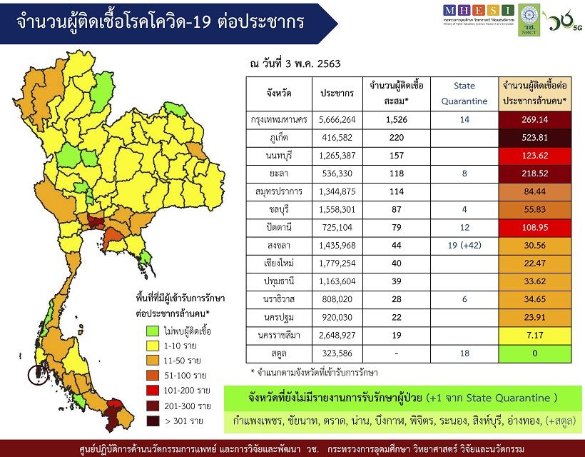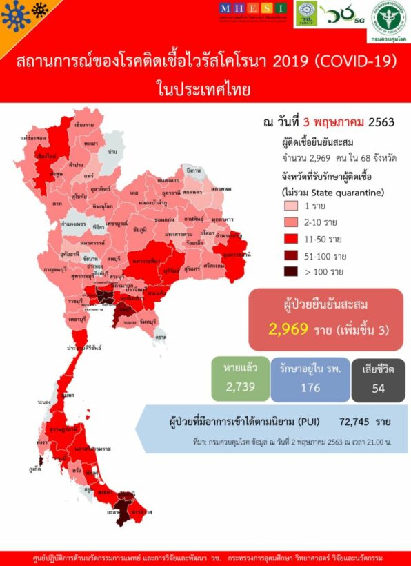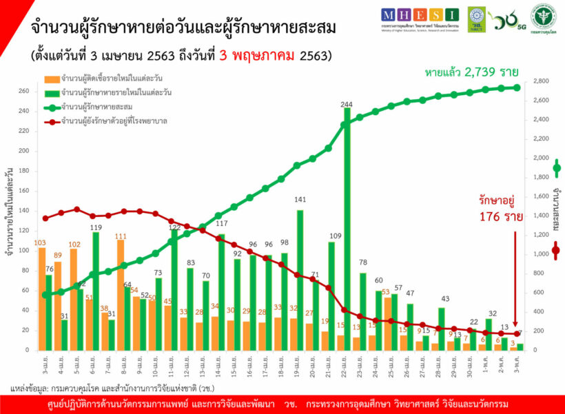 โควิด-19 -กรมควบคุมโรค และศูนย์ปฏิบัติการด้านนวัตกรรมการแพทย์ และการวิจัยและพัฒนา สำนักงานการวิจัยแห่งชาติ (วช.) กระทรวงการอุดมศึกษาฯ (อว.) รายงานข้อมูลสถานการณ์การติดเชื้อโควิด-19 ณ วันอาทิตย์ที่ 3 พฤษภาคม 2563