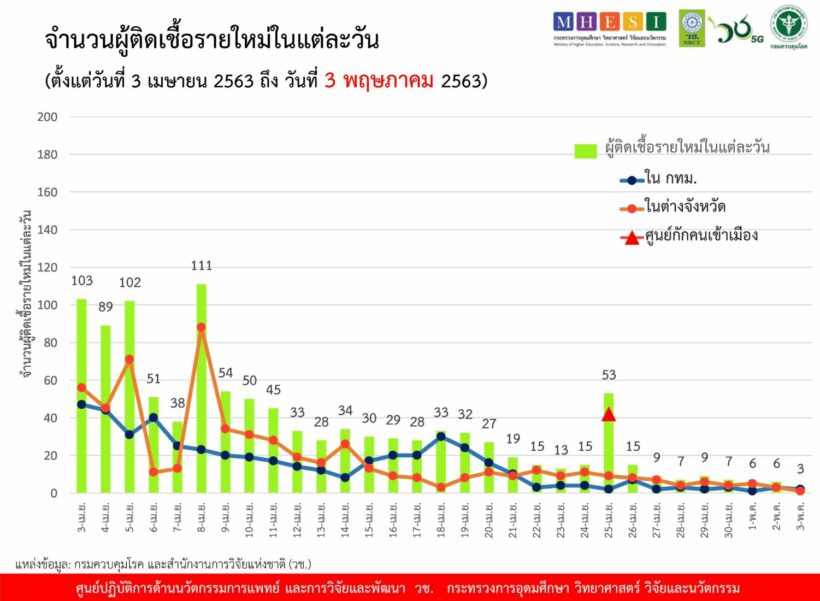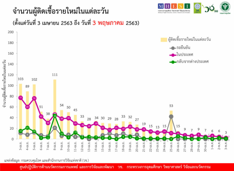 สถานการณ์โควิด-19 3 พฤษภาคม ไทยติดเชื้อเพิ่ม 3 ราย ไม่มีผู้เสียชีวิต