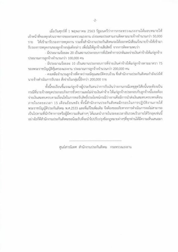 เมื่อวันศุกร์ที่ 1 พฤษภาคม 2563 รัฐมนตรีว่าการกระทรวงแรงงานได้มอบหมายให้เจ้าหน้าที่ของทุกส่วนราชการของกระทรวงแรงงาน เร่งระดมประสานงานติดตามนายจ้างจำนวนกว่า 50,000 ราย ให้เข้ามารับรองการหยุดงาน รวมทั้งสำนักงานประกันสังคมจะได้ออกหนังสือแจ้งนายจ้างให้เข้ามารับรองการหยุดงานของลูกจ้างกลุ่มดังกล่าว เพื่อไม่ให้ลูกจ้างเสียสิทธิ์ จากการติดตามพบว่า
