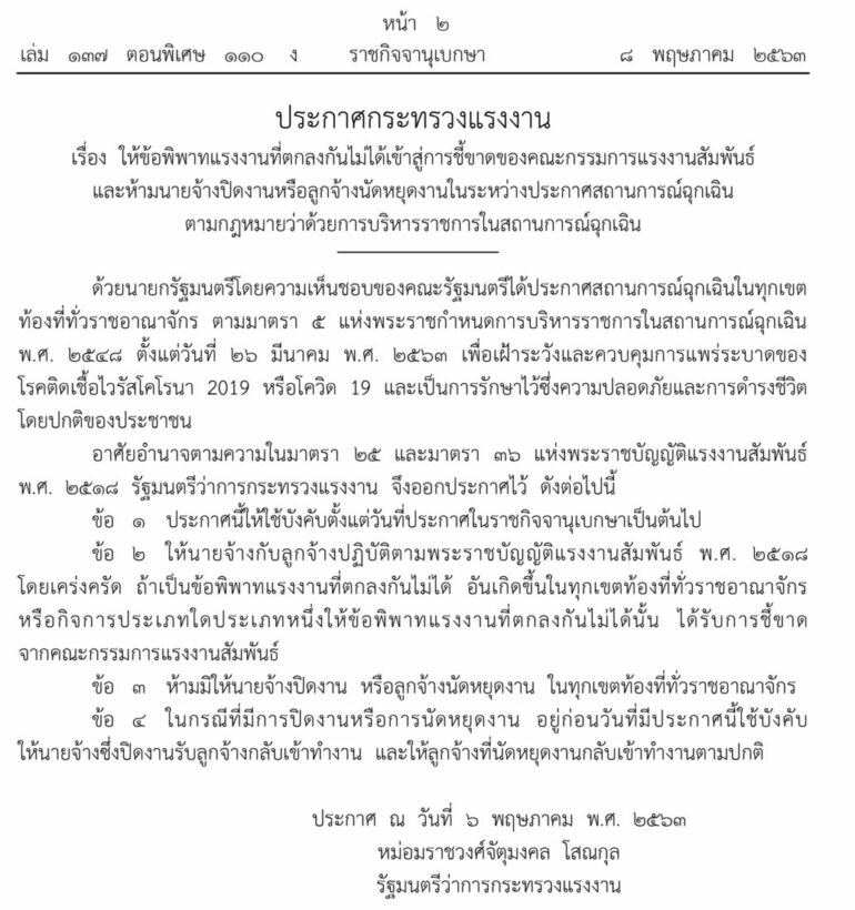 9 พฤษภาคม – เว็บไซต์ราชกิจจานุเบกษา เผยแพร่ ประกาศกระทรวงแรงงาน เรื่อง ให้ข้อพิพาทแรงงานที่ตกลงกันไม่ได้เข้าสู่การชี้ขาดของคณะกรรมการแรงงานสัมพันธ์ และห้ามนายจ้างปิดงาน หรือลูกจ้างนัดหยุดงานในระหว่างประกาศสถานการณ์ฉุกเฉิน ตามกฎหมายว่าด้วยการบริหารราชการในสถานการณ์ฉุกเฉิน