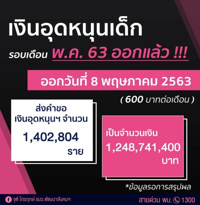 เฟซบุ๊ก “จุติ ไกรฤกษ์ รมว.พัฒนาสังคมฯ” ได้โพสต์ข้อความแจ้งว่า เงินอุดหนุนเด็กแรกเกิดรอบเดือน พฤษภาคม 2563 จำนวน 600 บาท ออกแล้วเมื่อวันที่ 8 พฤษภาคม 2563 ส่งคำขอเงินอุดหนุนเด็ก จำนวน 1,402,804 ราย เป็นจำนวนเงิน 1,248,741,400 บาท