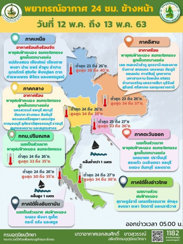 กรมอุตุฯ พยากรณ์อากาศ 24 ชั่วโมงข้างหน้า นับตั้งแต่วันที่ 12-13 พ.ค. ประเทศไทยตอนบนจะมีพายุฤดูร้อนเกิดขึ้น โดยมีลักษณะของพายุฝนฟ้าคะนอง ลมกระโชกแรงและลูกเห็บตกบางแห่ง