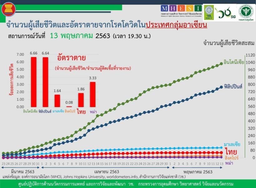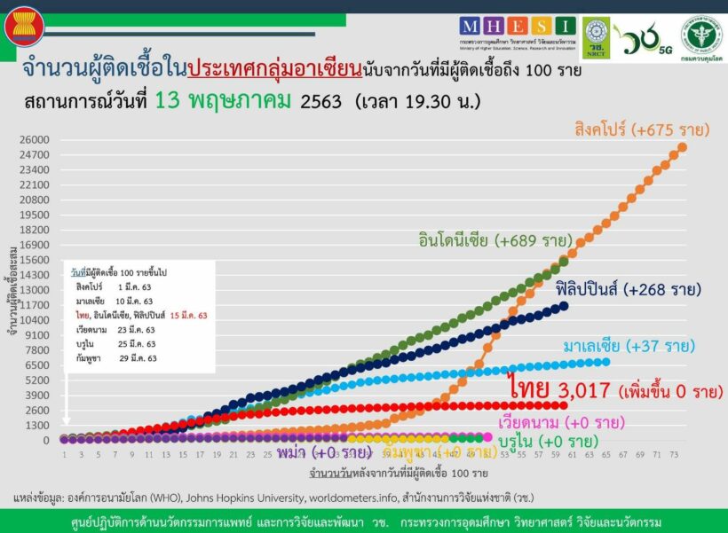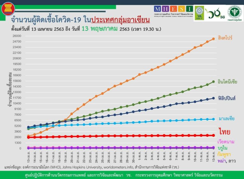 ศูนย์ปฏิบัติการด้านนวัตกรรมการแพทย์ และการวิจัยและพัฒนา สำนักงานการวิจัยแห่งชาติ (วช.) กระทรวงการอุดมศึกษาฯ (อว.) รายงาน สถานการณ์การติดเชื้อโควิด-19 ในอาเซียน ณ วันที่ 13 พฤษภาคม 2563 เวลา 19.30 น.