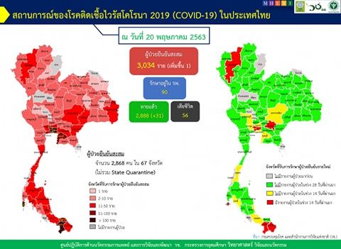 ประเทศไทย ผู้ติดเชื้อสะสม 3,034 ราย ใน 68 จังหวัด (เพิ่มขึ้นในวันนี้ 1 ราย) เสียชีวิตรวม 56 ราย (ไม่มีผู้เสียชีวิตเพิ่มขึ้นในวันนี้)