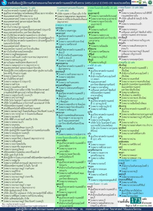 ในระหว่างวันที่ 16-22 พฤษภาคม 2563 ได้ตรวจไปแล้ว 45,481 ตัวอย่าง โดยห้องปฏิบัติการที่ได้รับการรับรองจากกรมวิทยาศาสตร์การแพทย์ 155 ห้องปฏิบัติการจากทั้งหมดทั่วประเทศ 173 ห้องปฏิบัติการ