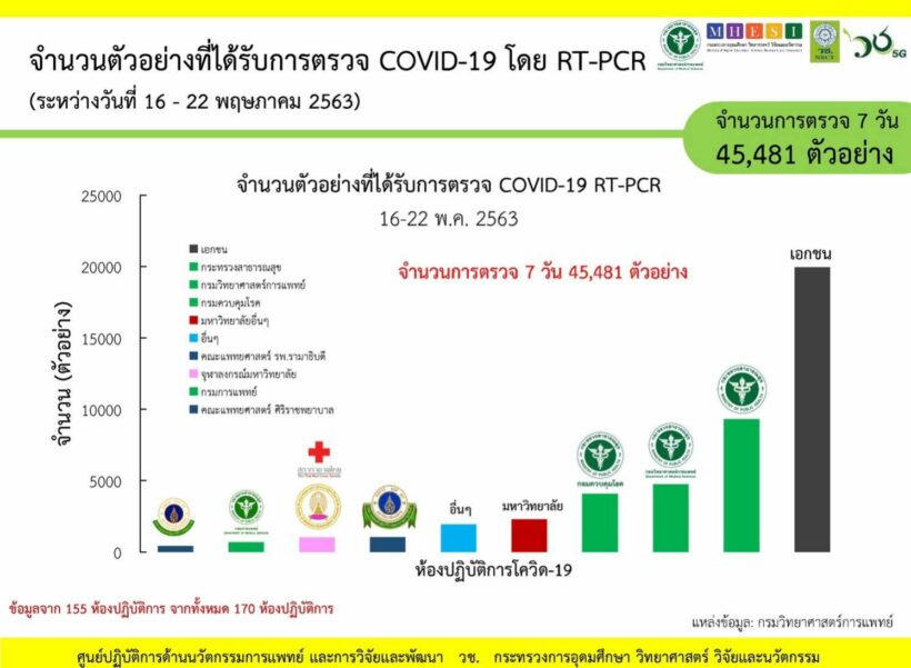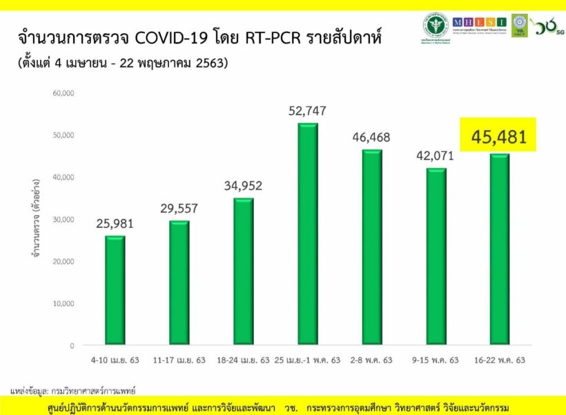 ในระหว่างวันที่ 16-22 พฤษภาคม 2563 ได้ตรวจไปแล้ว 45,481 ตัวอย่าง โดยห้องปฏิบัติการที่ได้รับการรับรองจากกรมวิทยาศาสตร์การแพทย์ 155 ห้องปฏิบัติการจากทั้งหมดทั่วประเทศ 173 ห้องปฏิบัติการ