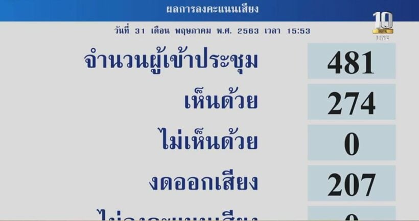 1.พ.ร.ก.แก้ไขและเยียวยาฯ เห็นด้วย 274 ไม่เห็นด้วย 0 คน งดออกเสียง 207 คน
