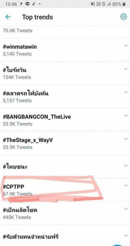 บิ๊นท์ยังแคปหน้าจอที่มีแฮชแท็ก #CPTPP กำลังขึ้นเทรนด์ในทวิตเตอร์ พร้อมเขียนว่า “ดันค่ะ”