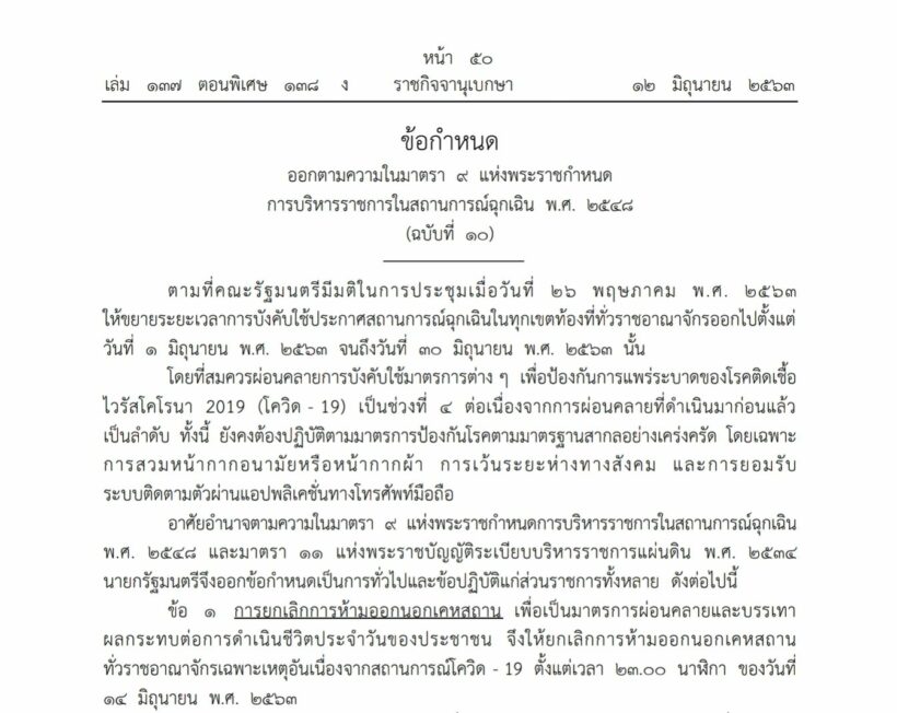 ในข้อกำหนดการบริหารราชกาในสถานการณ์ฉุกเฉิน พ.ศ. 2547 วันที่ 12 มิ.ย. ข้อ 1 ระบุว่า การยกเลิกการห้ามออกนอกเคหสถาน เพื่อเป็นมาตรการผ่อนคลายและผกระทบต่อการดำเนินชีวิตของประชาชน จึงยกเลิกการห้ามออกนอกคหสถานนอกราชอาณาจักรเพราะเหตุอันเนื่องสถานการณ์โควิด-19 ตั้งแต่เวลา 23.00 น. ของวันที่ 14 มิถุนายน 2563