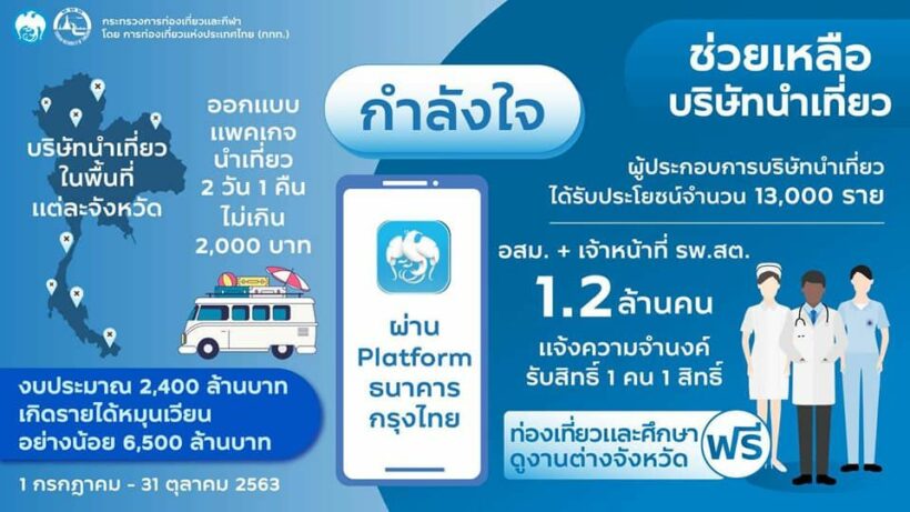 ซึ่งโครงการนี้จะช่วยผู้ประกอบการนำเที่ยวได้รับประโยชน์ราว 13,000 ราย และเกิดรายได้หมุนเวียนในระบบเศรษฐกิจอย่างน้อย 6,500 ล้านบาท