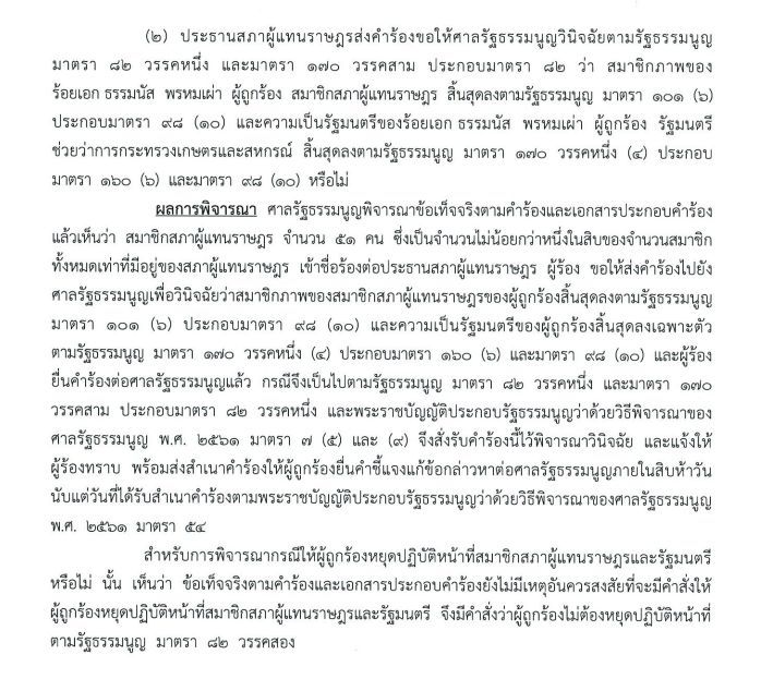 ผลการพิจารณา ศาลรัฐธรรมนูญพิจารณาข้อเท็จจริงตามคำร้องและเอกสารประกอบคำร้องแล้ว จึงสั่งให้รับคำร้องนี้ไว้พิจารณาวินิจฉัย และแจ้งให้ผู้ร้องทราบ พร้อมส่งสำเนาคำร้องให้ร้อยเอกธรรมนัสยื่นคำชี้แจงข้อกล่าวหาต่อศาลรัฐธรรมนูญภายใน 15 วัน