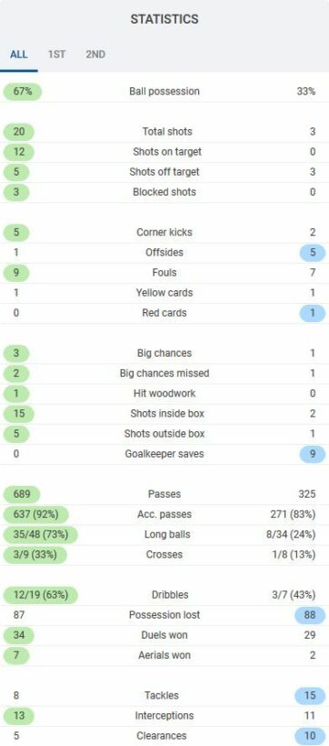 เท่ากับว่าตอนนี้ทั้งสองทีมเหลือผู้เล่นในสนาม 10 คนเท่ากันแล้ว เนื่องจาก ซิตี้ เปลี่ยนผู้เล่นครบโควตา 5 คนไปเรียบร้อย – ผู้ตัดสินสั่งทดเวลาบาดเจ็บนานถึง 11 นาที