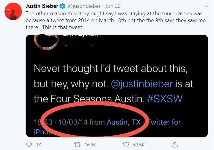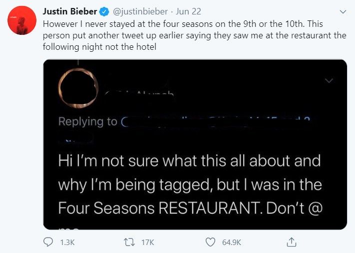 จากนั้นจัสตินก็ได้โพสต์ว่าที่มีคนเห็นตนอยู่ที่โรงแรมโฟร์ซีซั่น เพราะทวิตเมื่อวันที่ 10 มีนาคม 2014 ไม่ใช่วันที่ 9 มีนาคม แต่ตนก็ยืนยันว่าไม่ได้เข้าพักที่โรงแรมดังกล่าวทั้งวันที่ 9 และ 10 ผู้ใช้ทวิตเตอร์คนนี้ ทวีตว่าเห็นตนที่ร้านอาหารในคืนถัดไป ไม่ใช่ที่โรงแรม