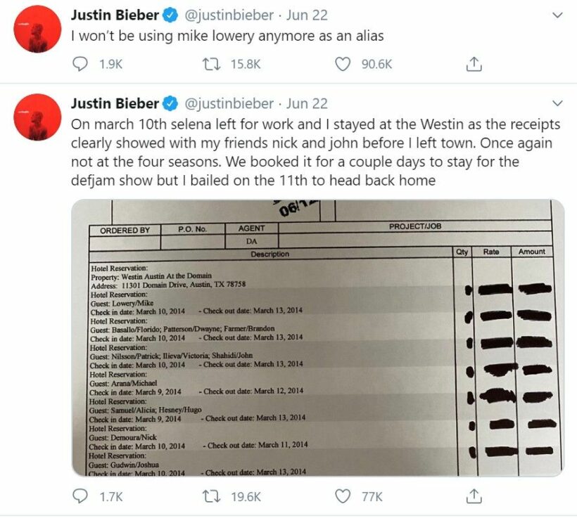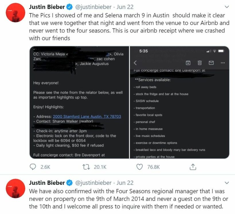 นอกจากนี้นักร้องหนุ่มยังโชว์หลักฐานว่าตนจองที่พักที่ AirBnB กับเซเลน่าและเพื่อนๆ ในวันที่ 9 มีนาคม และวันที่ 10 มีนาคม อยู่ที่ Westin จองโรงแรม LÀ Quinta ไม่ใช่โรงแรมโฟร์ซีซั่น พร้อมถ่ายใบเสร็จเป็นหลักฐานทั้ง 2 ที่พัก สามารถยืนยันกับผู้จัดการที่โรงแรมโฟร์ซีซั่นได้ว่าไม่เคยไปที่นั่นเลย และตนยินดีตอบคำถามกับสื่อ