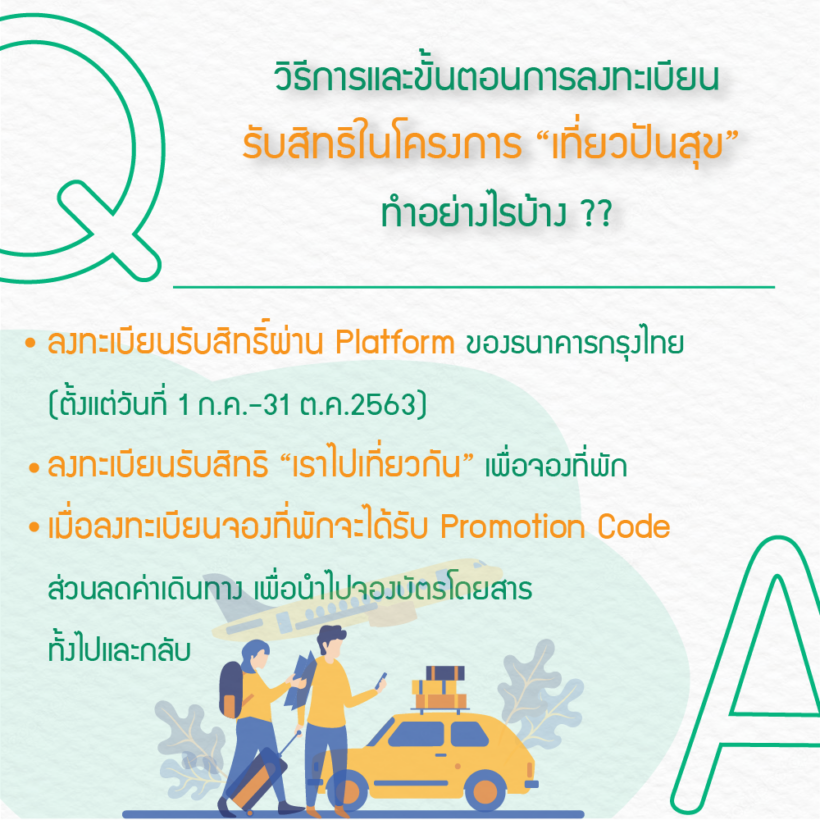 - ลงทะเบียนเที่ยวปันสุข รับสิทธิ์ผ่านแพลตฟอร์ม ของธนาคารกรุงไทย (ตังแต่วันที่ 1 ก.ค. – 31 ต.ค. 2563) เพื่อรับสิทธิ์ส่วนลดบัตรโดยสาร
