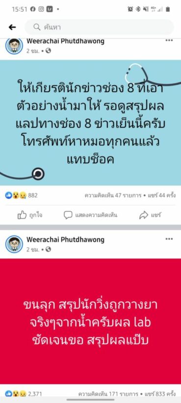 โดย อ.อ๊อด อ.อ๊อด วีรชัย พุทธวงศ์ ได้โพสต์ผ่านเฟซบุ๊กระบุว่า “ให้เกียรตินักข่าวช่อง 8 ที่เอาตัวอย่างน้ำมาให้ รอดูสรุปผลแลปทางช่อง 8 ข่าวเย็นนี้ครับ โทรศัพท์หาหมอทุกคนแล้วแทบช็อก” “ขนลุกสรุปนักวิ่งถูกวางยาจริง ๆ จากน้ำครับ ผลแลปชัดเจน สรุปผลแป๊ป”
