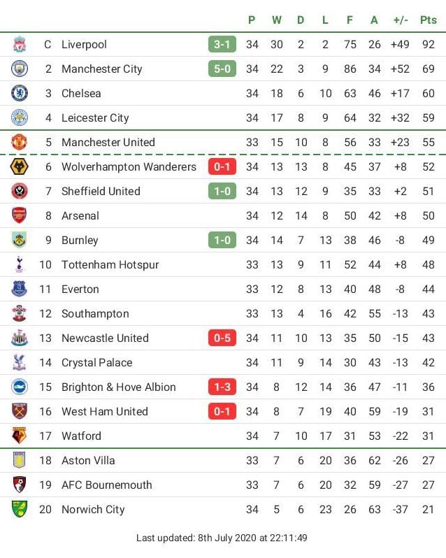 21/06/20 แพ้ เชลซี 1-2 (เหย้า) พรีเมียร์ลีก