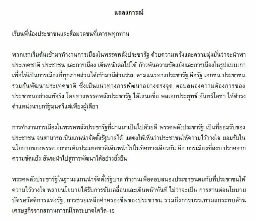 พวกเราเริ่มต้นเข้ามาทำงานการเมืองในพรรคพลังประชารัฐ ด้วยความหวังและความมุ่งมั่นว่าจะนำพาประเทศชาติ ประชาชน และการเมือง เดินหน้าต่อไปได้ ก้าวพ้นความขัดแย้งและการเมืองในรูปแบบเก่า เพื่อให้เป็นการเมืองที่ทุกภาคส่วนได้เข้ามามีส่วนร่วม ตามแนวทางประชารัฐ คือรัฐ เอกชน ประชาชน ร่วมกันพัฒนาประเทศชาติ ซึ่งเป็นแนวทางการพัฒนาอย่างตรงจุด ตอบสนองความต้องการของประชาชนอย่างแท้จริง โดยทางพรรคพลังประชารัฐ ได้เสนอชื่อ พลเอกประยุทธ์ จันทร์โอชา ให้ดำรงตำแหน่งนายกรัฐมนตรีแต่เพียงผู้เดียว