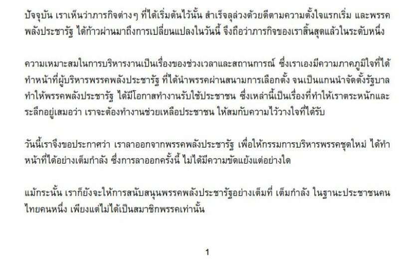วันนี้เราจึงขอประกาศว่า เราลาออกจากพรรคพลังประชารัฐ เพื่อให้กรรมการบริหารพรรคชุดใหม่ ได้ทำหน้าที่ได้อย่างเต็มกาลัง ซึ่งการลาออกครั้งนี้ ไม่ได้มีความขัดแย้งแต่อย่างใด
