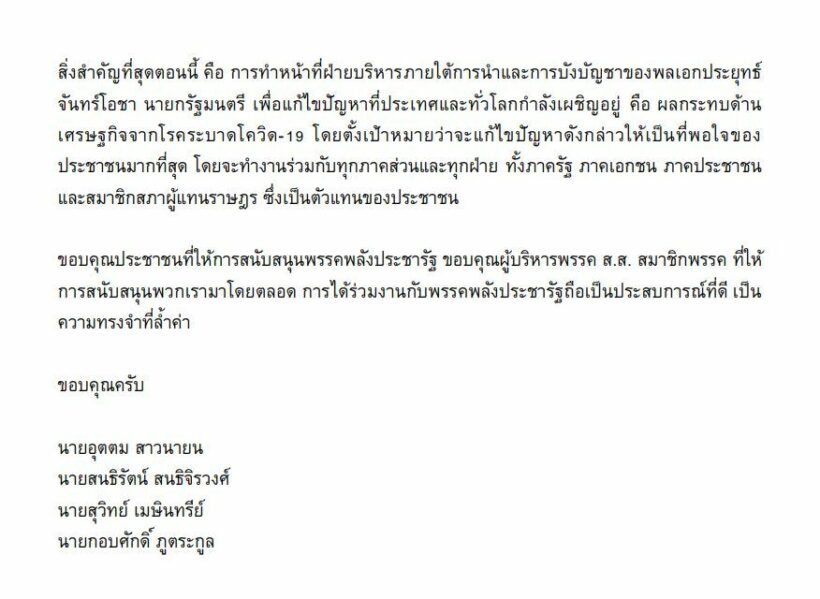 ‘4 กุมาร’ เปิดแถลงการณ์ ลาออกจากพลังประชารัฐ