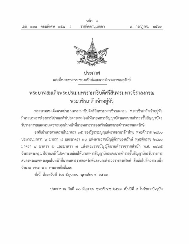 ราชกิจจานุเบกษา ประกาศ โปรดเกล้าฯ แต่งตั้งนายทหาร-ตำรวจราชองค์รักษ์ จำนวน 364 นาย