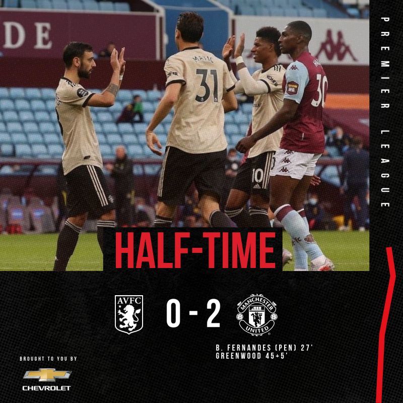 GOAL !!! แต่เป็น แมนยู ที่ได้ประตูออกนำ 1-0 จากจังหวะที่ อ็องโตนี่ มาร์กซิยาล ที่ได้บอลทางกราบขวา ก่อนจะพยายามทำชิ่งกับ แรชฟอร์ด แต่ไปติดแนวรับ วิลล่า และเลยมาเข้าทางของ บรูโน่ ที่พยายามจะเหยียบบอลและหมุนตัวและปะทะกับ เอซรี่ คอนซ่า และล้มลงไป ทำให้ผู้ตัดสินเช็ก VAR และให้จุดโทษ ก่อนที่ บรูโน่ จะลุกขึ้นมาสังหารเข้าไปไม่พลาด เป็นจุดโทษที่ 13 ของ ยูไนเต็ด