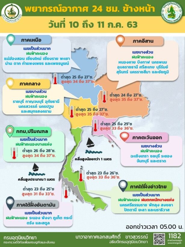 กรมอุตุนิยมวิทยารายงาน พยากรณ์อากาศวันที่ 10 – 11 ก.ค. 2563 ฝนฟ้าคะนองทั่วประเทศ