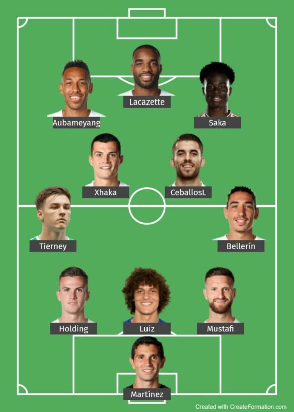 - (GK) มาร์ติเนซ, มุสตาฟี่, ลุยซ์, โฮลดิ้ง, เบเญริน, เซบาญอส, ชาก้า, เทียร์นีย์, ซาก้า, ลากาแซตต์ และ ปิแอร์-เอเมริค โอบาเมยอง