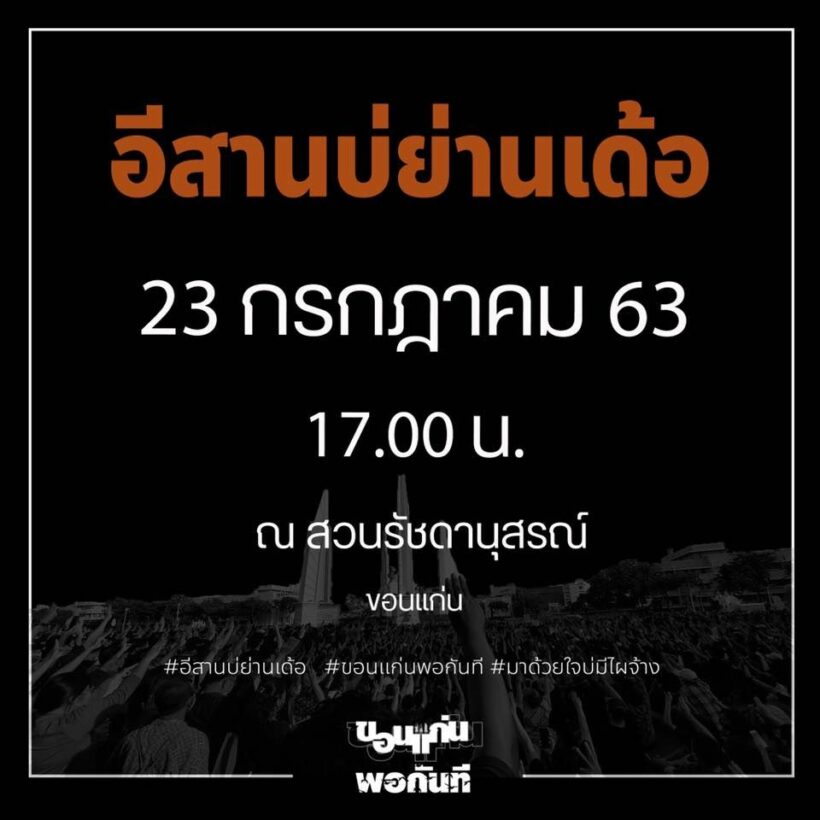 ขณะเดียวกัน เฟซบุ๊ก “ขอนแก่นพอกันที” ก็ประกาศนัดรวมพลนักศึกษาและประชาชน #อีสานบ่ย่านเด้อ วันที่ 23 ก.ค. 63 เวลา 17.00 น. ณ สวนรัชดานุสรณ์ (หน้าศาลากลาง)