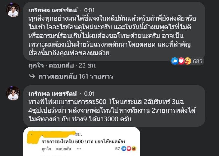 ส่วนเรื่องที่พ่อโทรไปขอส่วนแบ่ง 30% ด้วยคำพูดที่ไม่เหมาะสม ตอนนั้นตนเองก็อยู่ด้วยและได้ยินหมดทุกคำพูด ทางนั้นถามกลับมาว่า พ่อต้องการเท่าไหร่ เราคิดว่ามันไม่เหมาะสมที่ควรพูดกับผู้ใหญ่ จากนั้นก็ได้โชว์หลักฐานการโอนเงิน 20,000 บาท ที่ฝ่ายนั้นโอนมาให้ แต่ตนเองได้โอนกลับไปเพราะรู้ว่าทางนั้นเค้าไม่ได้ให้ด้วยใจ พร้อมถามกลับว่า ถ้าพ่อไม่โทรไป พี่จะคิดถึงตนบ้างมั้ย ไม่ได้เดือดร้อนอะไรเรื่องนี้มาก แต่เรื่องที่พ่อต้องมาถูกด่านั้นยอมไม่ได้